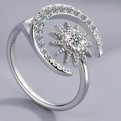 Capture the brilliance of the stars with this celestial-inspired silver ring. Featuring a radiant starburst design centered around a dazzling round-cut crystal, it’s gracefully wrapped in a crescent of shimmering pavé stones. The open band adds a modern twist, making it perfect for stacking or wearing solo. Crafted for comfort and durability, this Size 9 ring blends elegance and sparkle — ideal for both everyday wear and special occasions.